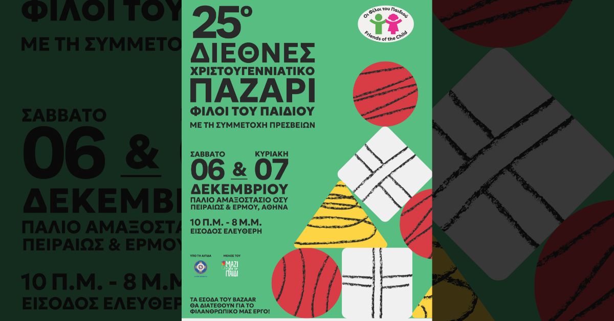 Δεν χάνουμε το πιο χαρούμενο, πολύχρωμο, πολυφυλετικό χριστουγεννιάτικο μπαζάρ της πόλης που διοργανώνουν «Οι φίλοι του Παιδιού» με τη συμμετοχή 35 και πλέον Πρεσβειών. Το Φιλανθρωπικό Σωματείο «Οι Φίλοι του Παιδιού» πραγματοποιεί και φέτος για 25η χρονιά το καθιερωμένο Διεθνές Χριστουγεννιάτικο Bazaar του, στις 6 & 7 Δεκεμβρίου, στο Παλιό…
