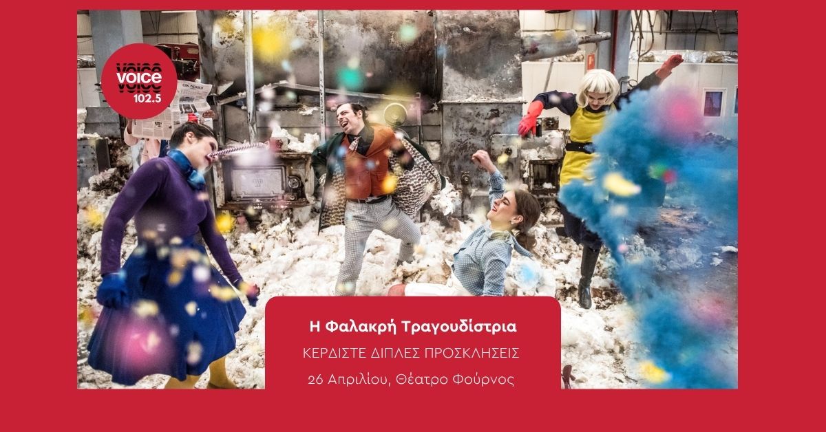 Κερδίστε διπλές προσκλήσεις για την παραστάσεις στις 26 Απριλίου, συμπληρώνοντας την παρακάτω φόρμα συμμετοχής. Oι νικητές θα ειδοποιηθούν μέσω email. ΚΩΔΙΚΟΣ: ΤΡΑΓΟΥΔΙΣΤΡΙA