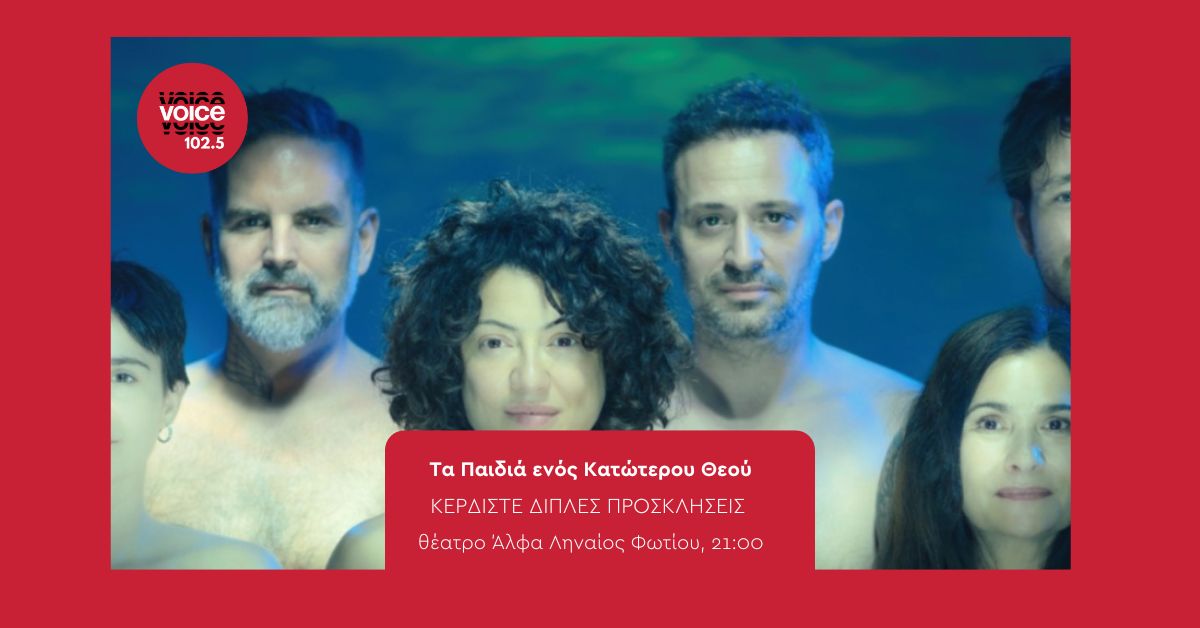 Κερδίστε διπλές προσκλήσεις για την παράσταση της Τρίτης 21 Οκτωβρίου στις 21:00, στο θέατρο Άλφα Ληναίος Φωτίου, συμπληρώνοντας την παρακάτω φόρμα συμμετοχής. Oι νικητές θα ειδοποιηθούν μέσω email. Κωδικός: ΠΑΙΔΙΑ