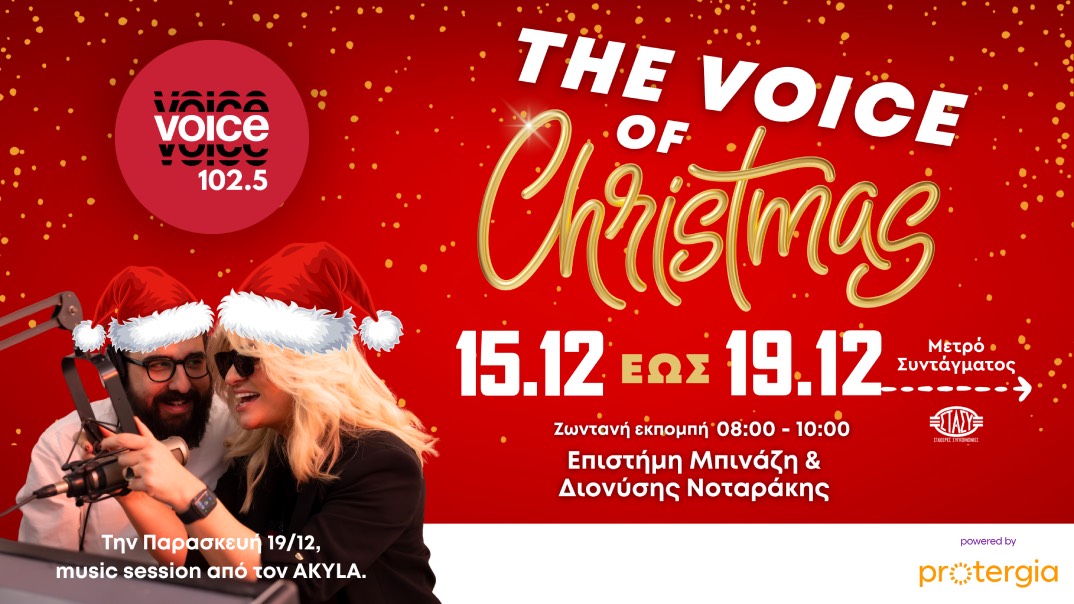 The Voice of Christmas Ο Voice 102.5 φοράει τα γιορτινά του και μπαίνει για τα καλά στο Christmas mood με την ενέργεια της Protergia. Από τη Δευτέρα 15 Δεκεμβρίου και για μία εβδομάδα, η Επιστήμη Μπινάζη και ο Διονύσης Νοταράκης κατεβαίνουν στο Μετρό Συντάγματος και μεταφέρουν εκεί όλο το πρωινό…